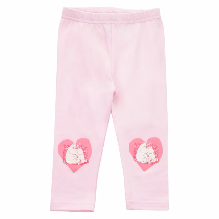 Mjuka och mysiga Mumin leggings för baby. Infälld resår i midjan och söta rubbertryck på bena. Produkten innehåller certierad ekologisk bomull.