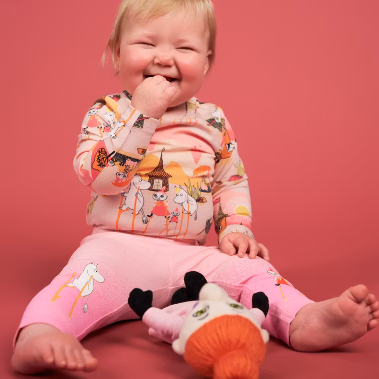 Mjuka och mysiga Mumin leggings för baby. Infälld resår i midjan och söta rubbertryck på bena. Produkten innehåller certierad ekologisk bomull.