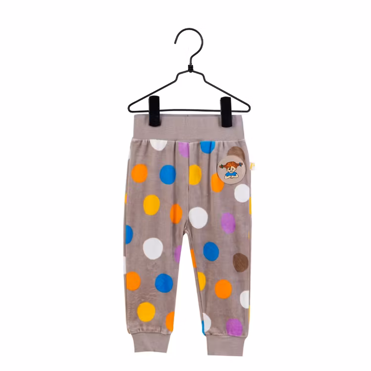 En underbart mjuk och skön babybyxa i beige velour av återvunnen polyester. Byxan är härligt helmönstrad med fina färgbubblor i vitt, gult, orange, lila och blått och upptill finns det ett runt Pippi-märke. Resåren i midjan och muddarna i bensluten ä r beige.