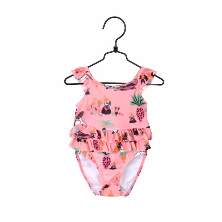 En söt, milt rosa baddräkt med små prickar ton i ton. Baddräkten är helmönstrad med Lilla My, Mumintrollet och Snorkfröken som precis hittat en jättelik pärlmussla. Baddräktens nederdel är fodrad och runt magen har den två rader härlig volang. Även axlarna är dekorerade med volangvingar.
