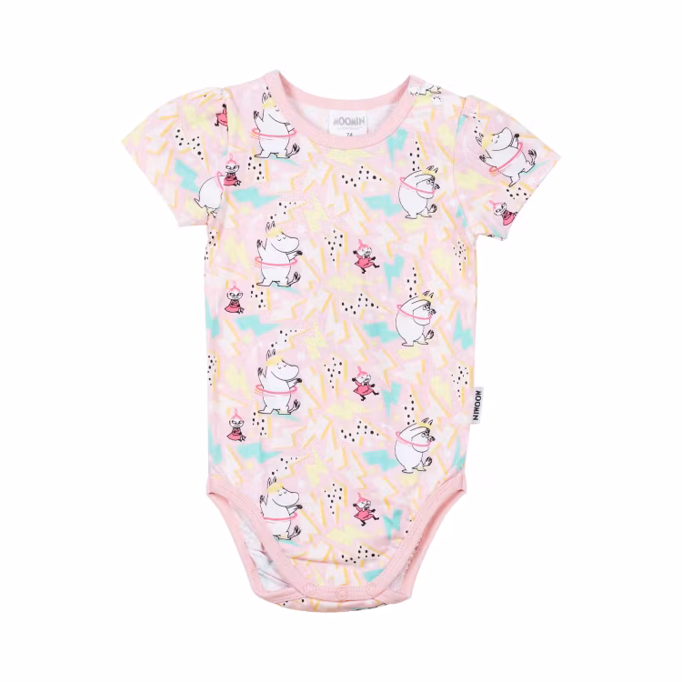 En mjuk och skön Mumin body för baby. Bodyn är kortärmad med tryckknappar på ena axeln och i grenen, där en lätt rynkning ger gott om plats för blöjan. Produkten innehåller certifierad ekologisk bomull.