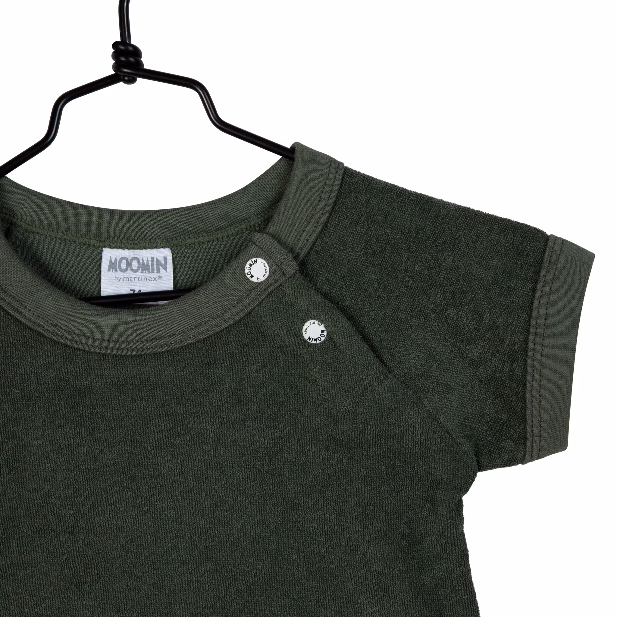 En skön sommardräkt i mjuk bomullsfrotté. Dräkten har korta ben med tryckknappar i grenen och kort ärm med tryckknappar vid vänster axel. Framtill finns det en känguruficka med en broderad bild av Mumintrollet, Snusmumriken och Lilla My.