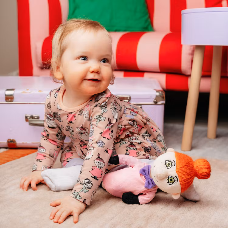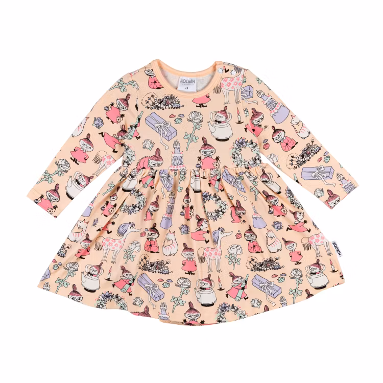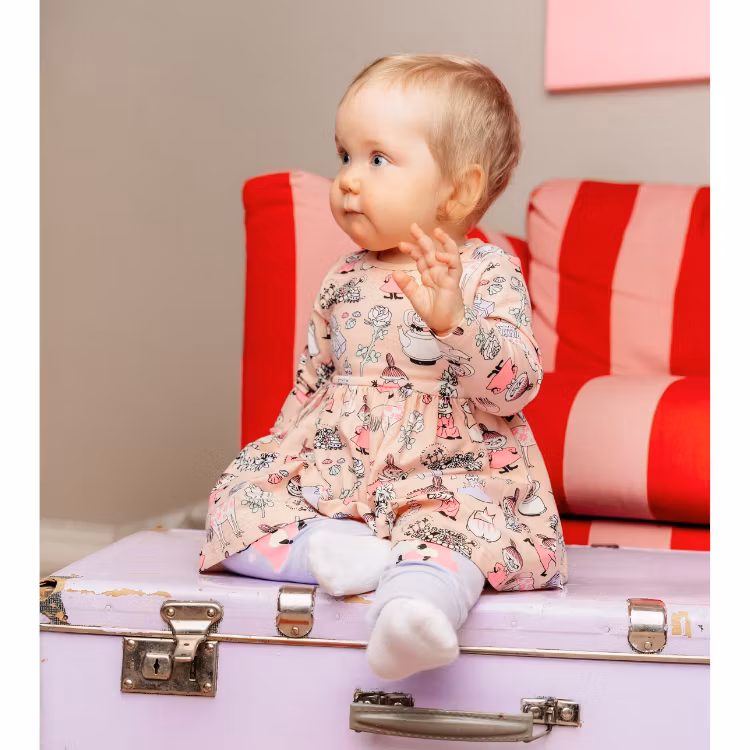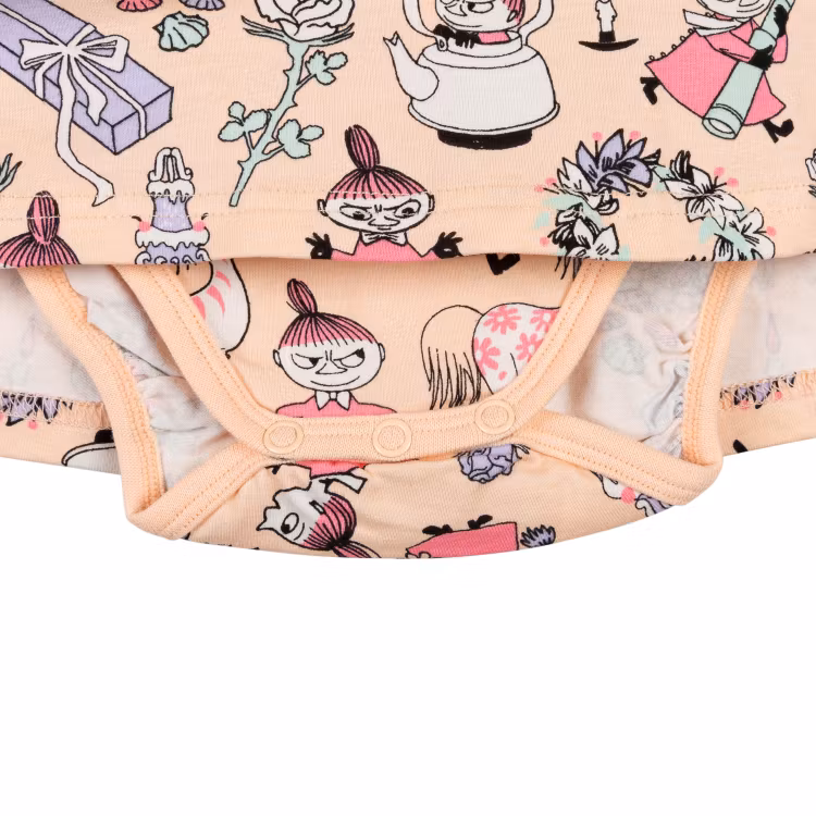 En mjuk och mysig Mumin bodyklänning för baby. Lång ärm, rund halsringning, tryckknappar på ena axeln och i grenen. Avskuren i midjan med rynk för fin och utställd kjoldel. Produkten innehåller certifierad ekologisk bomull. Öko-tex.
