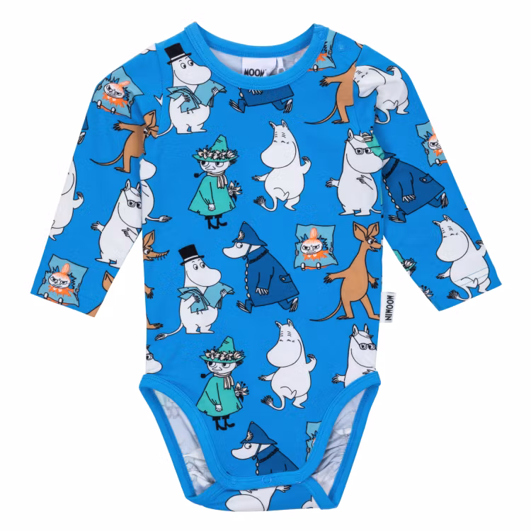En mjuk och skön Mumin body för baby. Bodyn är långärmad med tryckknappar på ena axeln och i grenen, där en lätt rynkning ger gott om plats för blöjan. Produkten innehåller certifierad ekologisk bomull.