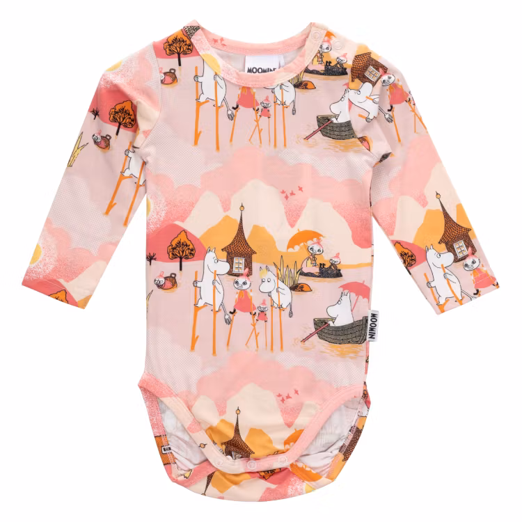 En mjuk och mysig Mumin body för baby. Med långa ärmar, tryckknappar på ena axeln och i grenen samt gott om plats för blöjan. Produkten innehåller certifierad ekologisk bomull. Öko-tex.
