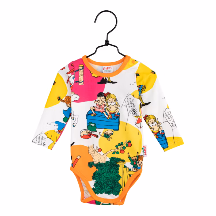 En långärmad, vit body med stora härliga färgbollar i anilinrött, orange och gult. Mitt ibland färgerna pysslar Pippi Långstrump med en massa skoj därhemma i Villa Villekulla. På axeln har bodyn två orange tryckknappar och i grenen finns det tre till. Halsringningen och grenen är kantade i orange och baktill finns det gott om plats för blöjan. På etiketten i sidsömmen står det Pippi Långstrump i glada bokstäver.