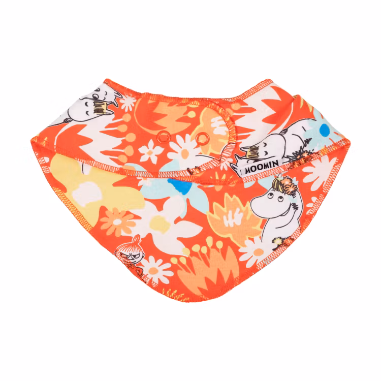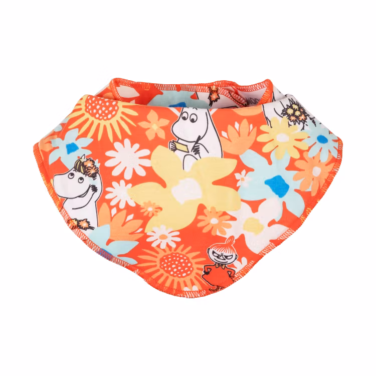 En mjuk och skön Mumin dregglis för baby. Storleken är justerbar med dubbla tryckknappar i nacken. Dregglisen är vändbar, med samma mönster på båda sidor. Skyddar babyns kläder från dregel och mat. Produkten innehåller certifierad ekologisk bomull. Öko-tex.