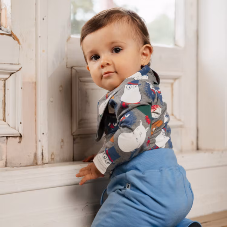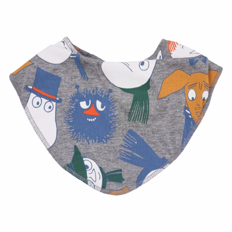 En mjuk och mysig Mumin dregglis för baby. Storleken är justerbar med dubbla tryckknappar i nacken. Dregglisen är vändbar, med samma mönster på båda sidor. Matchar andra plagg i kollektionen och skyddar babyns kläder från dregel och mat. Produkten innehåller certifierad ekologisk bomull.