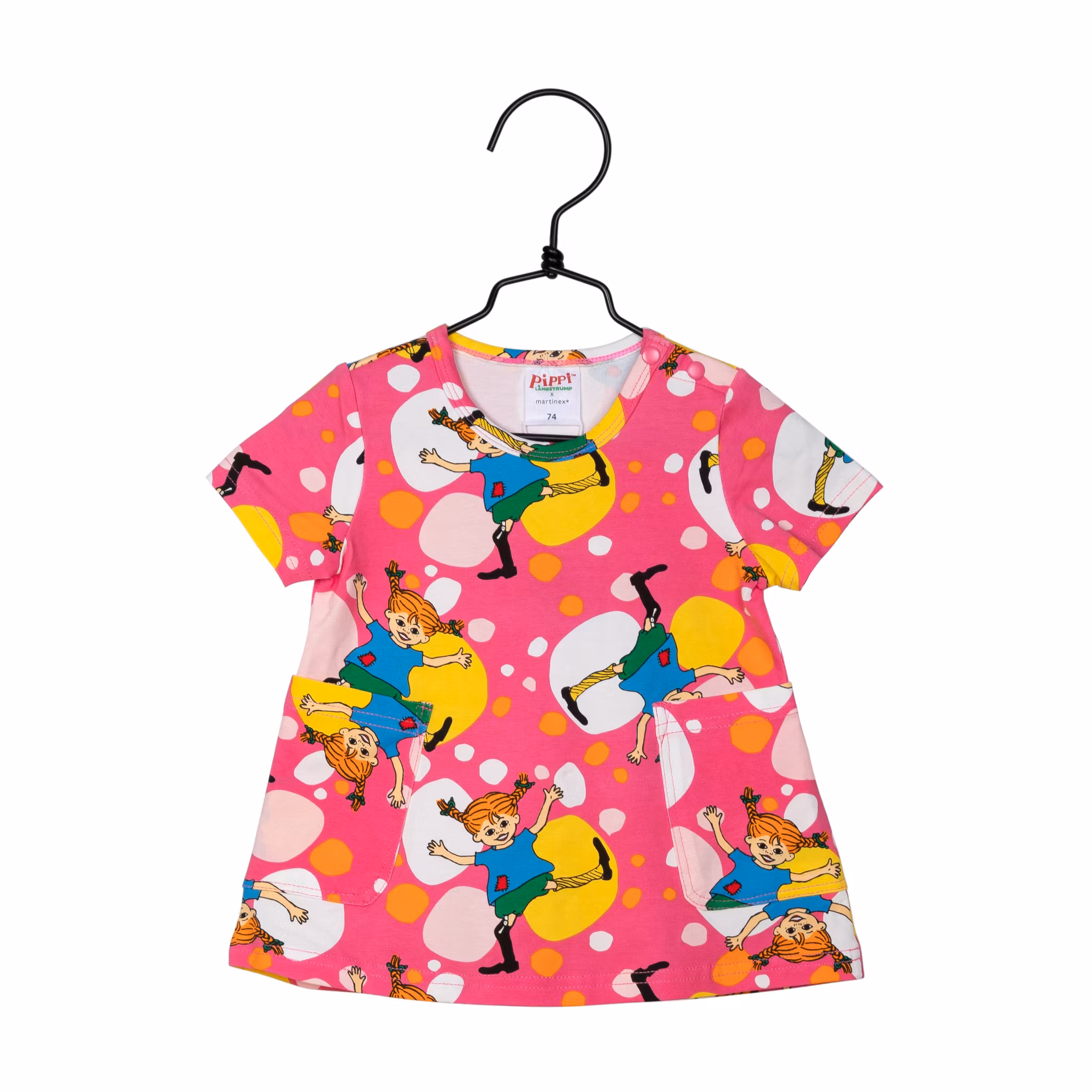 En kortärmad, kort tunika i härligt knallig ceris, helmönstrad med den glada, hjulande Pippi Långstrump. På den ena axeln finns det två tryckknappar för att underlätta påklädning och framtill två påsydda, rundade fickor i rejäl storlek. Ekologisk bomullsblandning.