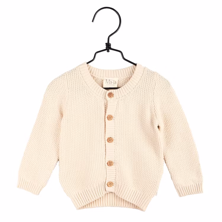 Det här kan också vara bra att veta: Mosstickad kofta med resår i halsringning, ärmslut och nederkant, knappar i tålig träimitation.