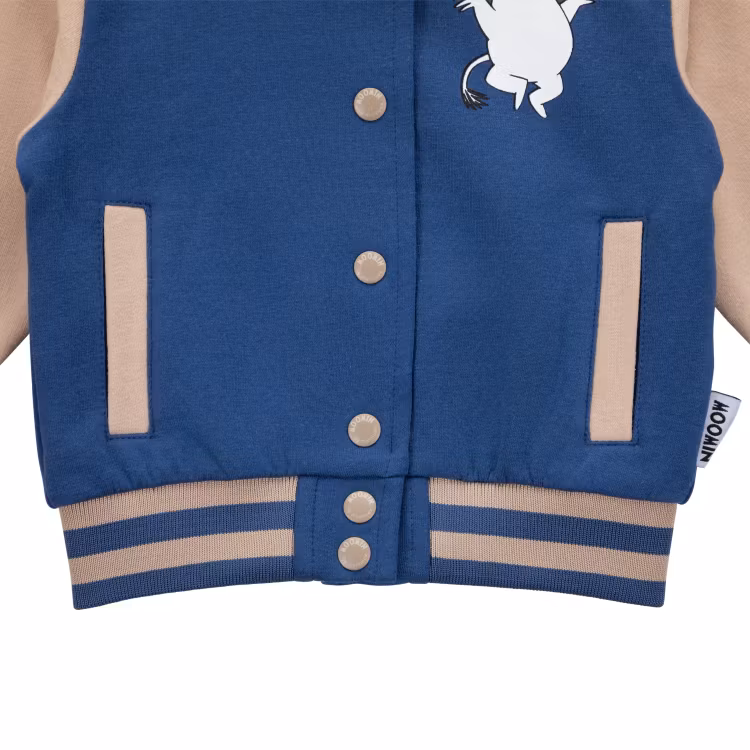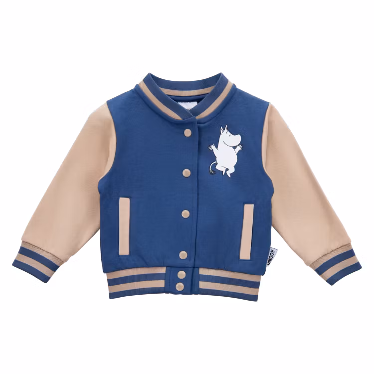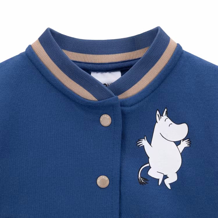 En mjuk och mysig Mumin bomberjacka i sweatshirtkvalitet för baby. Med fickor, tryckknappar framtill, muddar i halsringning, nederkant och ärmslut, samt ett fint Mumin-tryck framtill.
