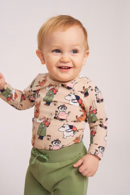 En mjuk, muminmönstrad babybody tillverkad i 95 % certifierad ekologisk bomull och 5 % elastan. Lång ärm, tryckknappar på ena axeln som underlättar påklädning, samt tryckknappar i grenen för blöjbyte. Öko-tex. Designad i Finland.