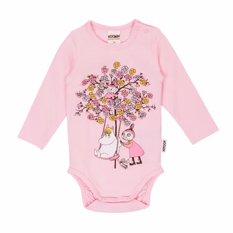 En mjuk babybody tillverkad i 95 % certifierad ekologisk bomull och 5 % elastan. Snorkfröken-rubbertryck framtill. Lång ärm, tryckknappar på ena axeln som underlättar påklädning, samt tryckknappar i grenen för blöjbyte. Öko-tex. Designad i Finland.