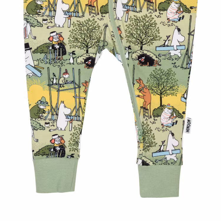 En mjuk, muminmönstrad babypyjamas tillverkad i 95 % certifierad ekologisk bomull och 5 % elastan. Lång ärm, mudd i bensluten, samt lång tvåvägsdragkedja som underlättar påklädning och blöjbyte. Öko-tex. Designad i Finland.