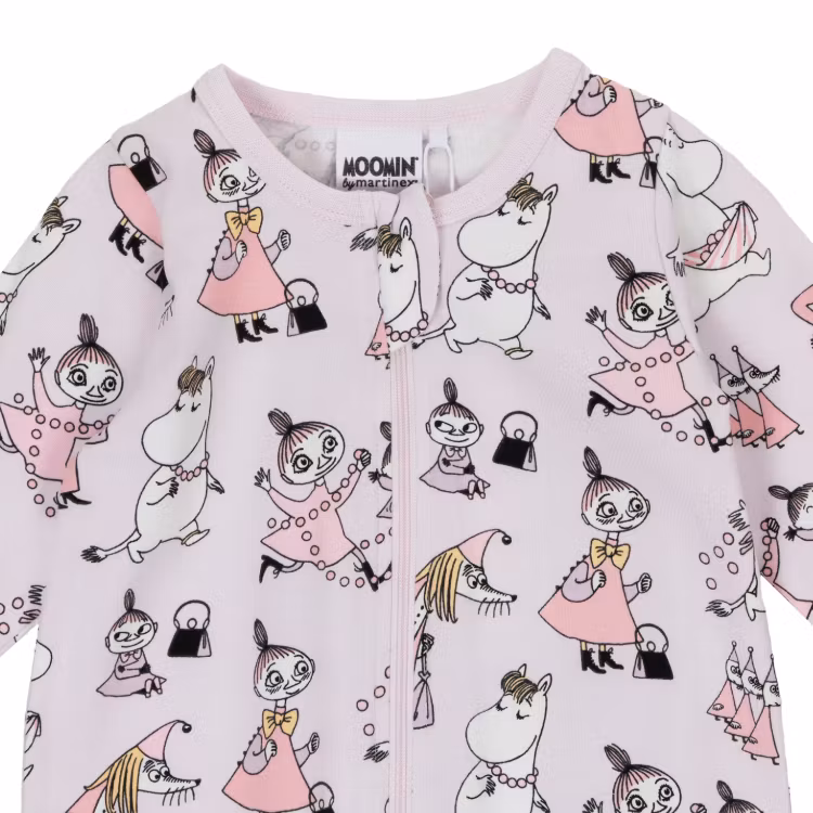 En mjuk, muminmönstrad babypyjamas tillverkad i 95 % certifierad ekologisk bomull och 5 % elastan. Lång ärm, mudd i bensluten, samt lång tvåvägsdragkedja som underlättar påklädning och blöjbyte. Öko-tex. Designad i Finland.