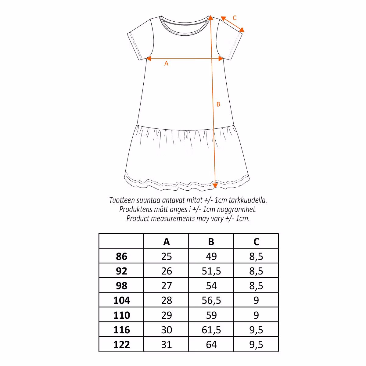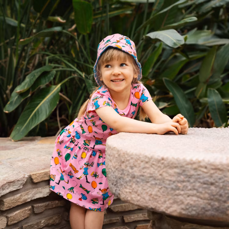 En mjuk och skön Pippi klänning för barn. Med kort ärm, rund halsringning och volang i kjoldelen. Produkten innehåller certifierad ekologisk bomull.