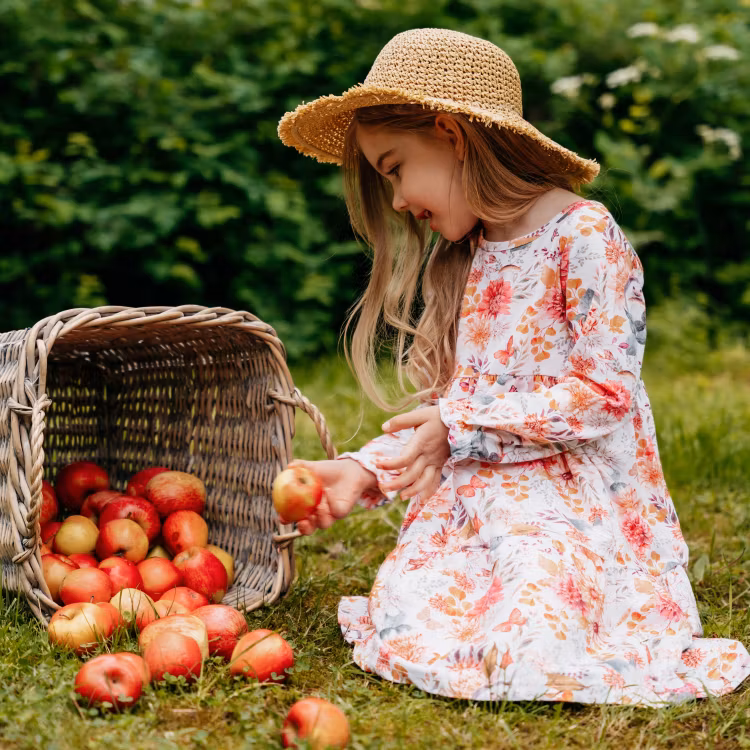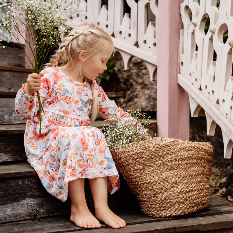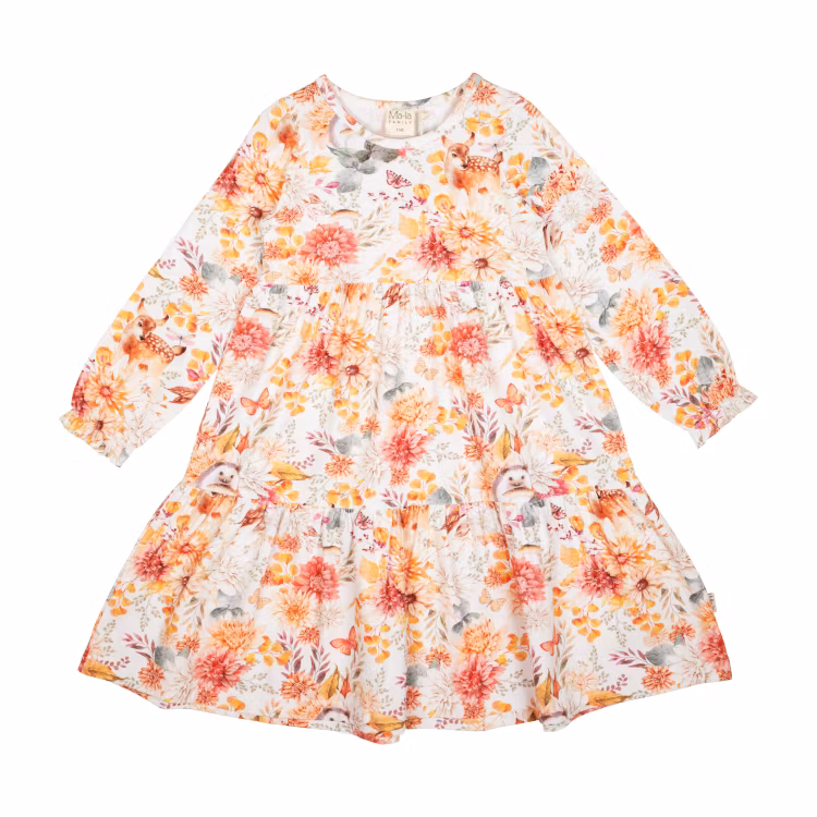 En vackert höstmönstrad Ma-ia Family klänning för barn. Lång ärm med infälld resår och rynk i ärmsluten, rund halsringning och avskärning i midjan med rynk och två breda volanger i kjoldelen. Produkten innehåller certifierad ekologisk bomull. Öko-tex.