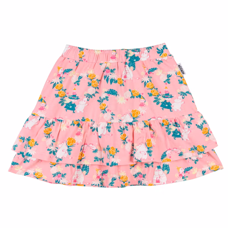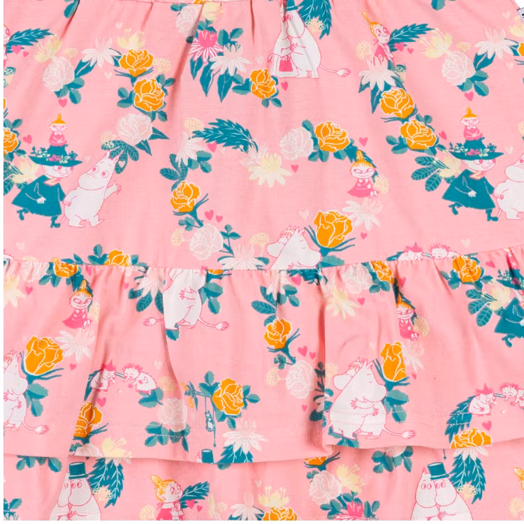 En mjuk och skön Mumin kjol för barn. Infälld resår i midjan och dubbel volang i kjoldelen. Produkten innehåller certifierad ekologisk bomull. Öko-tex.