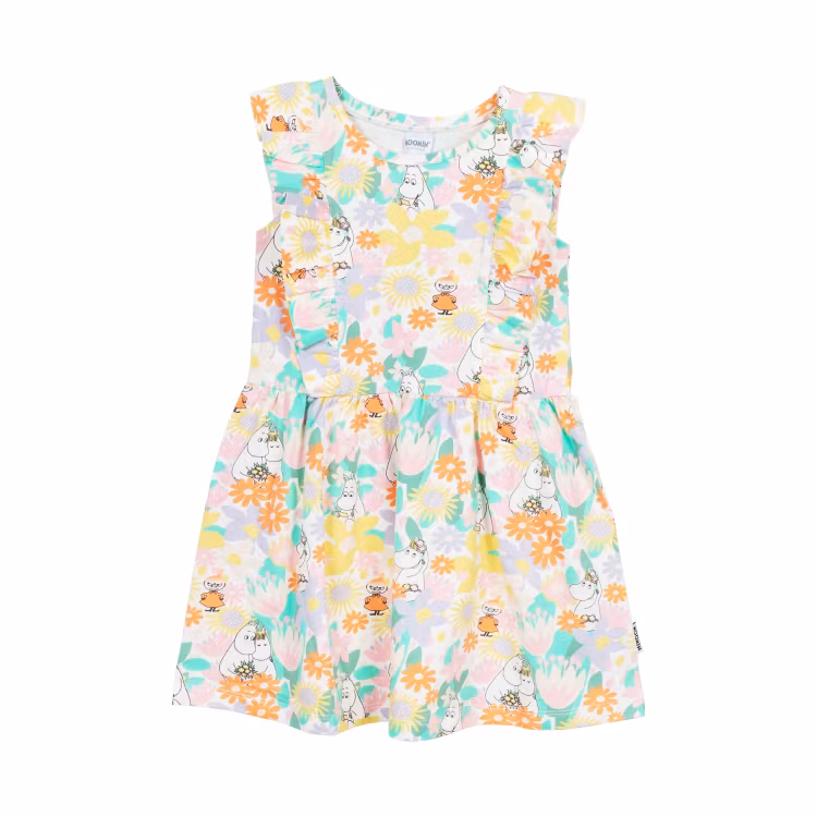 En mjuk och skön Mumin sommarklänning för barn. Den ärmlösa klänningen är avskuren med rynk i midjan, med fina volanger som går från midjan upp över axlarna och ned över ryggen. Produkten innehåller certifierad ekologisk bomull. Öko-tex.