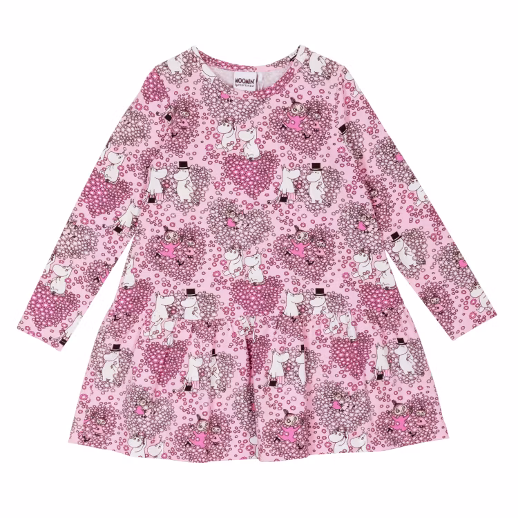 En mjuk, muminmönstrad barnklänning tillverkad i 95 % certifierad ekologisk bomull och 5 % elastan. A-linjeformad modell med lång ärm, rund halsringning och bred volangkant för vidd i kjoldelen. Öko-tex. Designad i Finland.