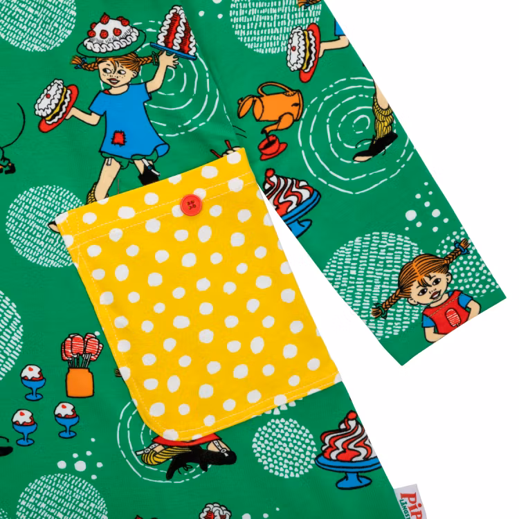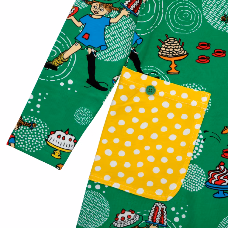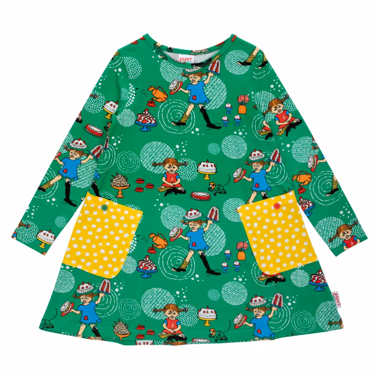 En mjuk och skön Pippi Långstrump-klänning för barn. Den A-linjeformade klänningen har lång ärm, rund halsringning och påsydda fickor med dekorationsknappar i kjoldelen. Produkten innehåller certifierad ekologisk bomull. Öko-tex.