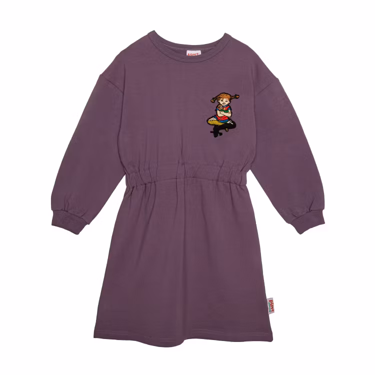 En mjuk och skön klänning i sweatshirtkvalitet med borstad insida. Klänningen är djupt violett med en broderad Pippi Långstrump-bild upptill. Den har infälld resår i midjan, nedhasad axelsöm och ribbad mudd i ärmsluten. Ekologisk bomullsblandning.