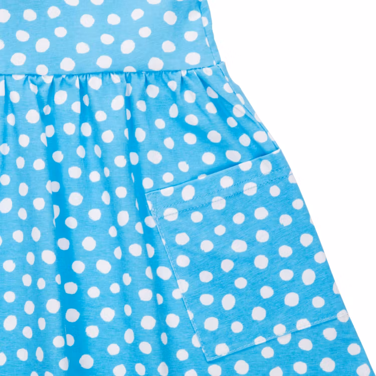En mjuk och skön Pippi klänning för barn. Ärmlös med rund halsringning och påsydda fickor i kjoldelen. Produkten innehåller certifierad ekologisk bomull.