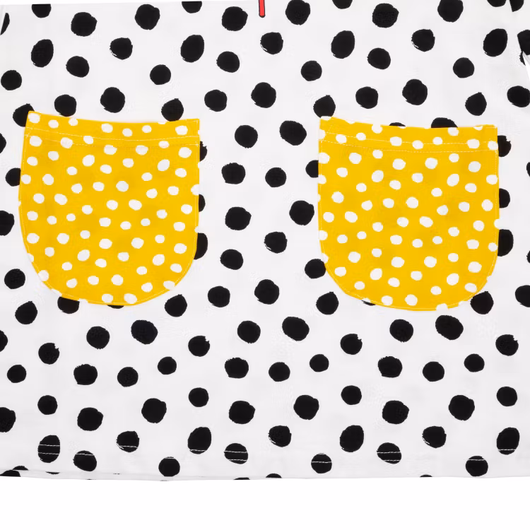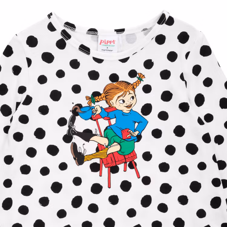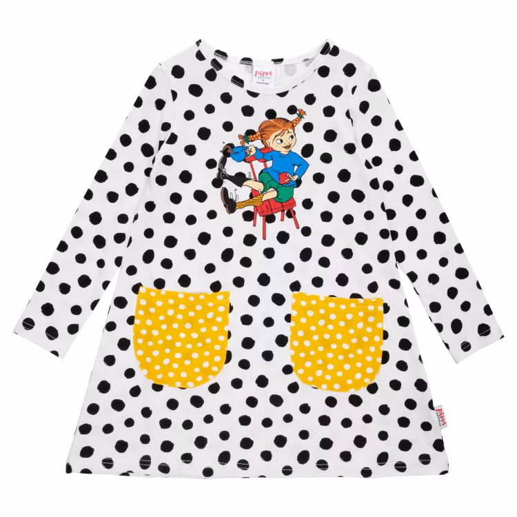 En mjuk och skön Pippi Långstrump-klänning för barn, i benvitt med svarta prickar och gula fickor. Den A-linjeformade klänningen har ett stort Pippi-rubbertryck framtill, lång ärm, rund halsringning och påsydda fickor. Produkten innehåller certifierad ekologisk bomull. Öko-tex.