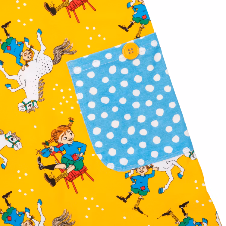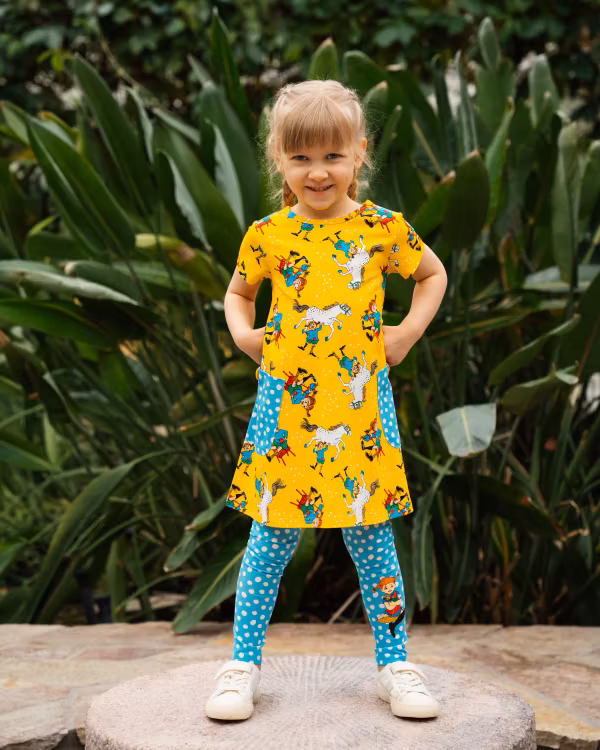 En mjuk och mysig Pippi klänning för barn. Den A-linjeformade klänningen har korta ärmar, en rund halsringning och påsydda fickor med dekorationsknappar i kjoldelen. Produkten innehåller certifierad ekologisk bomull.