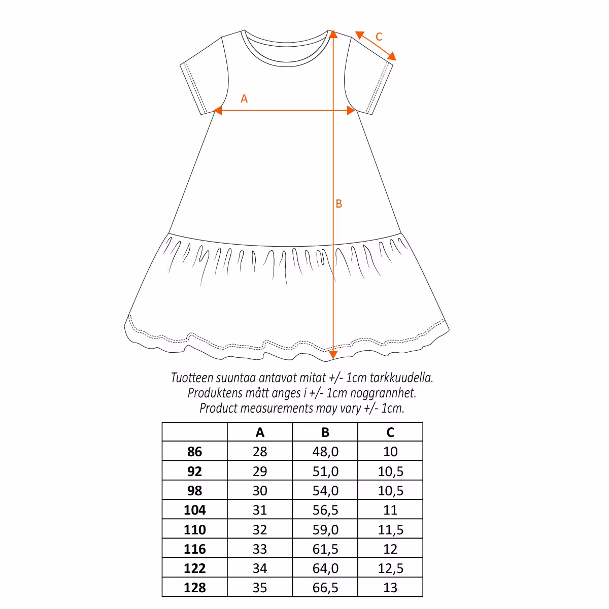 En mjuk och mysig Pippi klänning för barn. Den A-linjeformade klänningen har korta ärmar, en rund halsringning och volang i kjoldelen. Produkten innehåller certifierad ekologisk bomull.