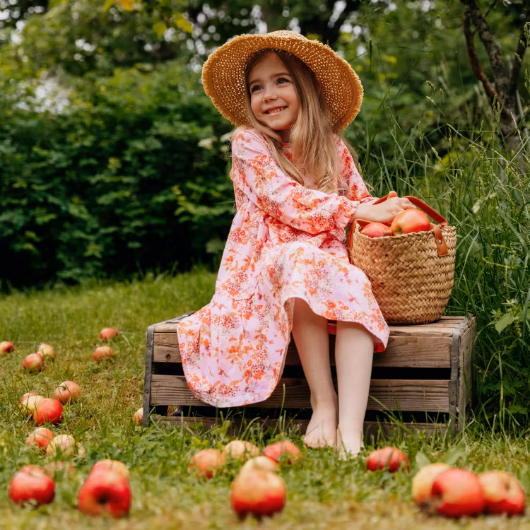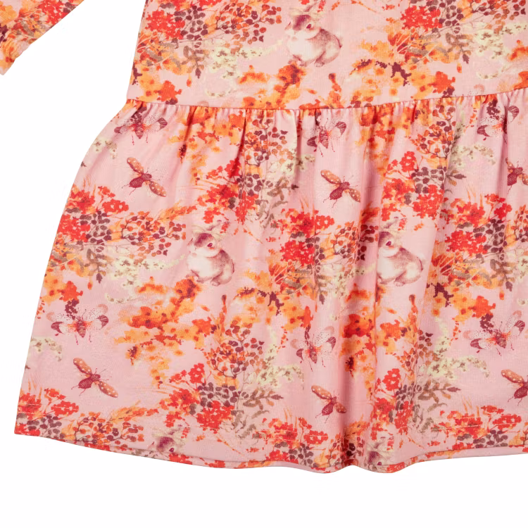 En sött kaninmönstrad och fin Ma-ia Family klänning för barn. Lång ärm med infälld resår och rynk i ärmsluten, rund halsringning och avskärning i midjan med rynk och två breda volanger i kjoldelen. Produkten innehåller certifierad ekologisk bomull. Öko-tex.