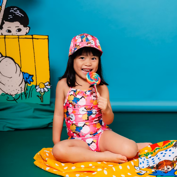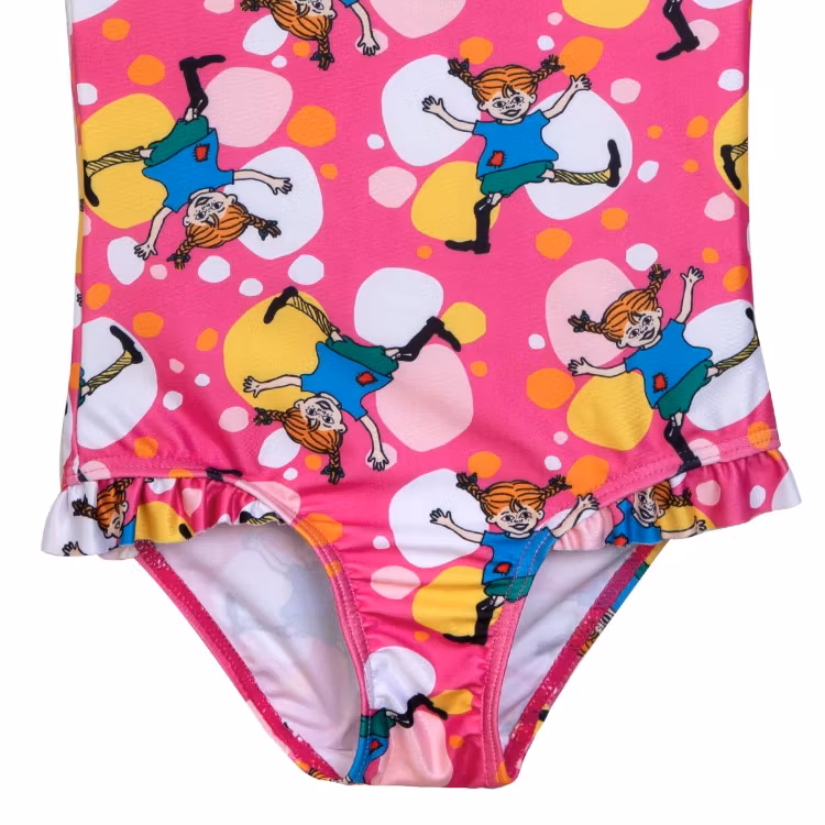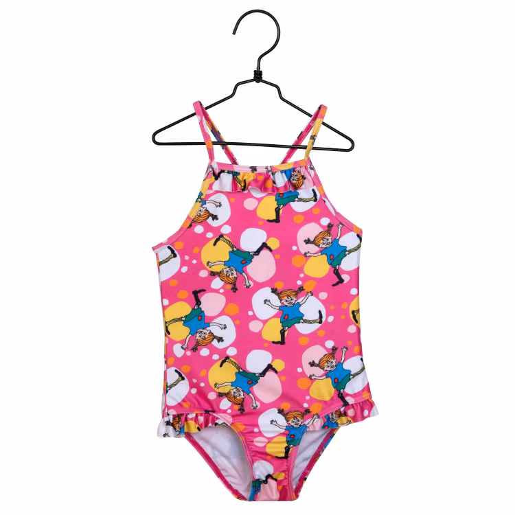 Helmönstrad baddräkt i ceris, med den glada Pippi Långstrump som hjular. Baddräkten är fodrad framtill, den är hög i ryggen och de tunna, korslagda axelbanden åker inte ned över axlarna. I övre kanten och vid benen har den små volangdekorationer. Tillverkad av snabbtorkande polyesterblandning.
