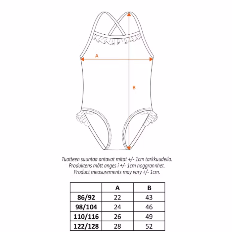 Skötsel: 40 °C – Tvätta med liknande färger, använd inte sköljmedel. Skölj plagget efter varje användning för att få bort klor och salt som sliter på tyget. Låt plagget hängtorka. Torka det inte i direkt solljus.