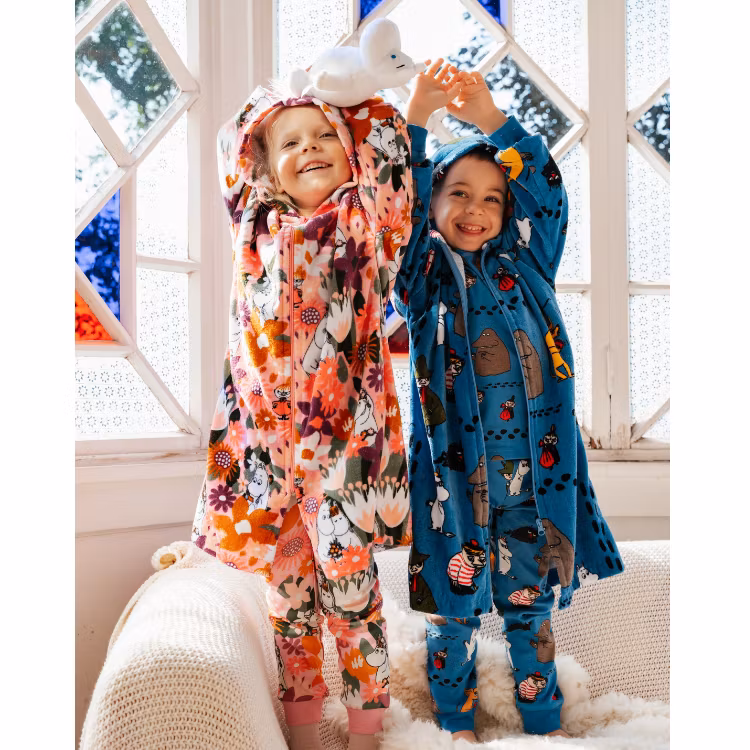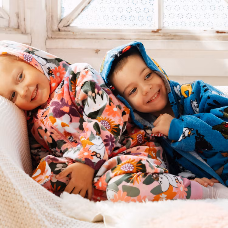 En mjuk Mumin badrock för barn. Badrocken har huva, upphängningsögla i nacken och blixtlås framtill. Materialet är mjuk bomullsvelour med insida av frotté med hög uppsugningsförmåga.