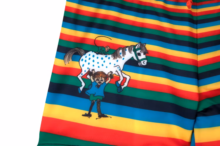 En färgglad, randig badbyxa i grönt, rött, gult och blått. På det högra benet finns det en bild på Pippi Långstrump, Lilla Gubben och herr Nilsson. Badbyxan är fodrad framtill. I midjan har den infälld resår och röd dragsko.