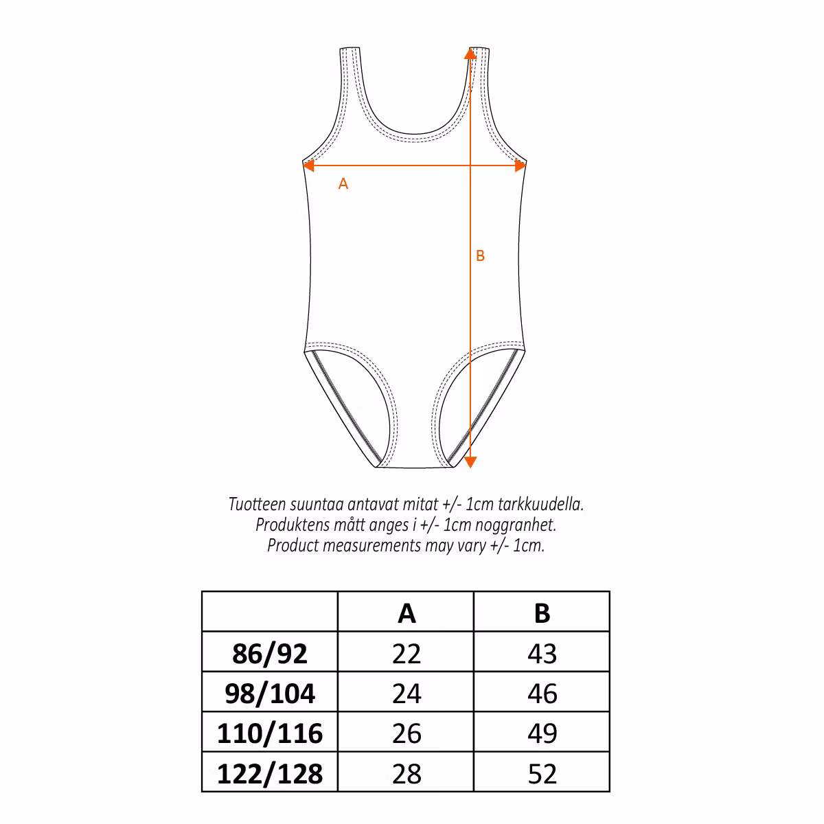 Skötsel: 40 °C – Tvätta med liknande färger, använd inte sköljmedel. Skölj plagget efter varje användning för att få bort klor och salt som sliter på tyget. Låt plagget hängtorka. Torka det inte i direkt solljus.