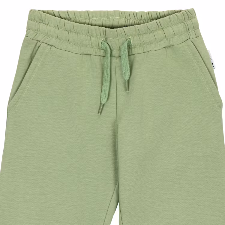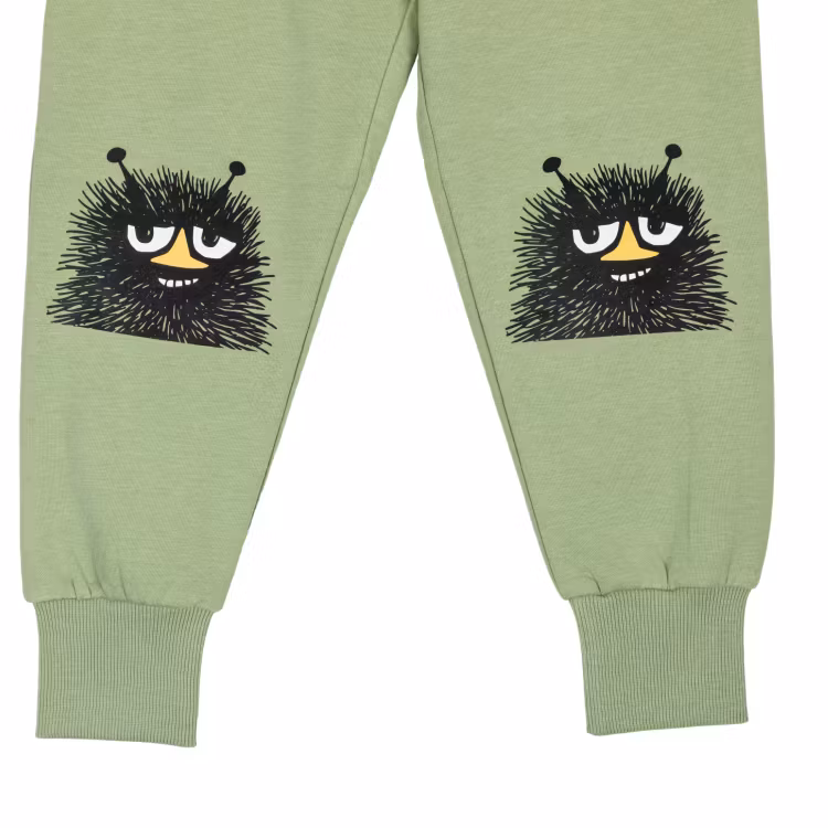 En mjuk Mumin collegebyxa för barn, tillverkad i sweatshirtkvalitet med borstad insida. Resårmidja med dragsko, fickor, ribbad mudd i bensluten och roliga Stinky-rubbertryck på knäna. Öko-tex. Designad i Fnland.