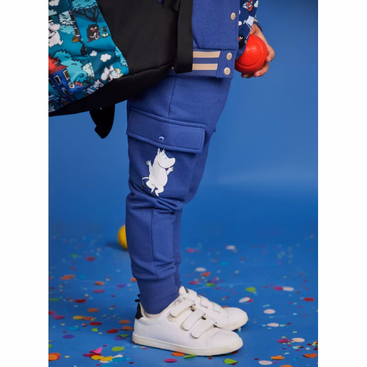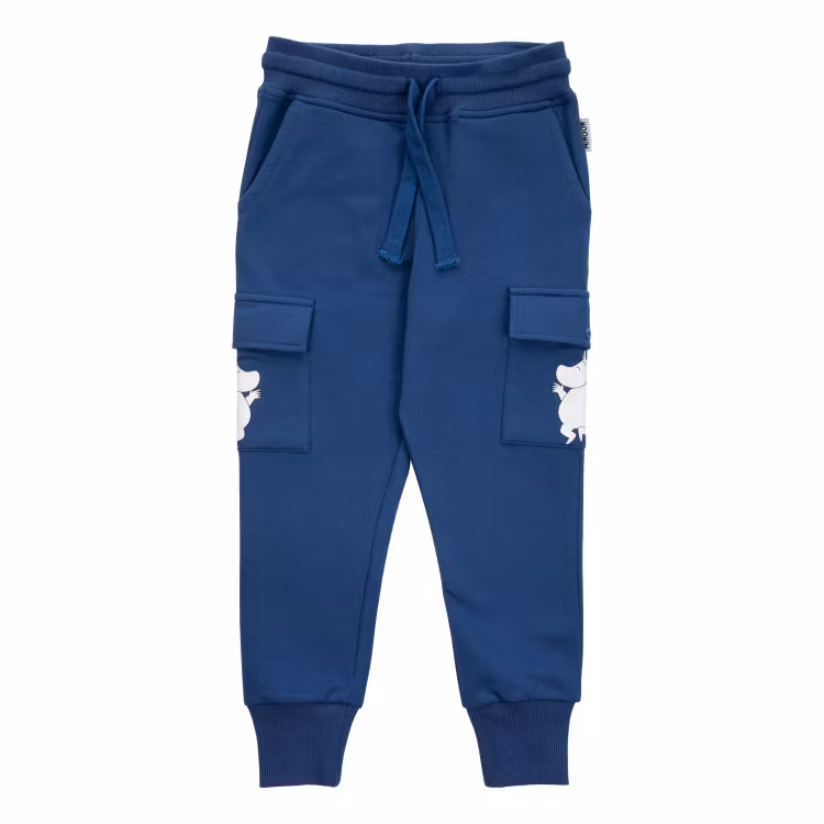 En mjuk och mysig Mumin collegebyxa för barn. Resår med dragsko i midjan, påsydda fickor i sidorna, roliga rubbertryck på fickorna och mjukt borstad insida.