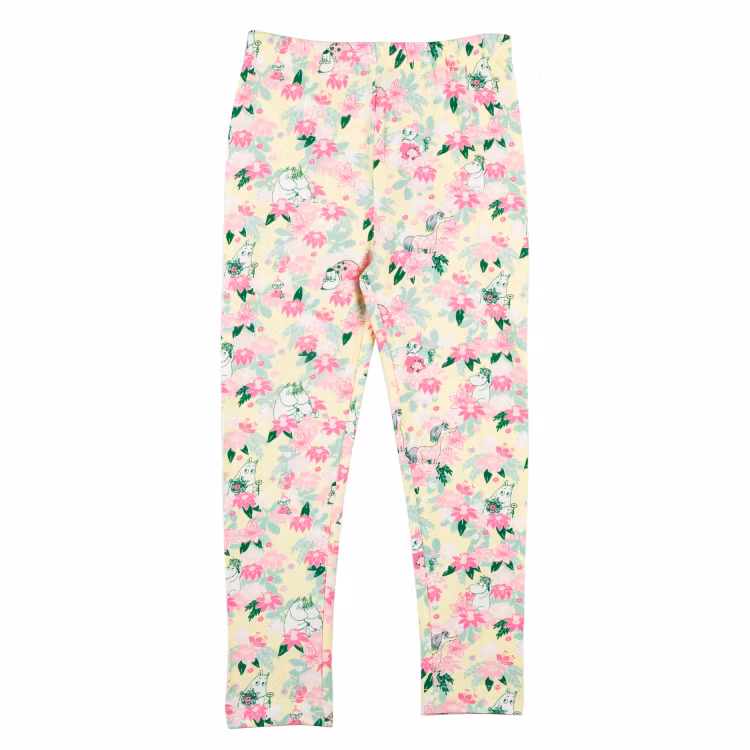 Mjuka och mysiga Mumin leggings för barn, med infälld resår i midjan. Produkten innehåller certifierad ekologisk bomull. Öko-tex.