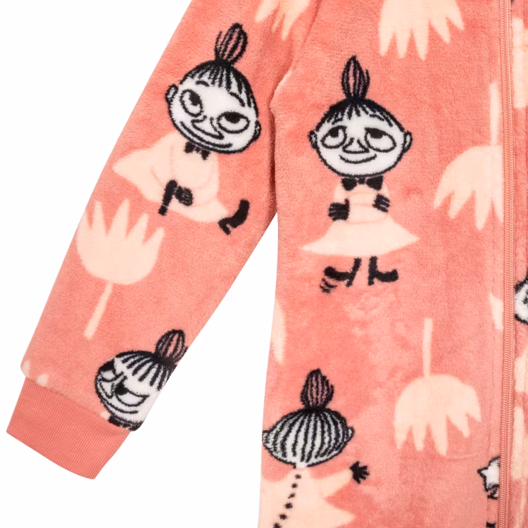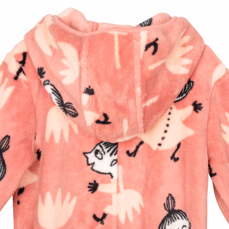 Supermjuk och gosig mysoverall i dubbelsidig fleece, där insida och utsida är lika mjuka och sköna. Overallen har huva och muddar i ärmslut och benslut. Den är rosa och helmönstrad med Lilla My på språng bland rosa tulpaner. Blixtlås med fin dragtapp i läderimitation. Tillverkad i återvunnen polyester. Öko-tex.