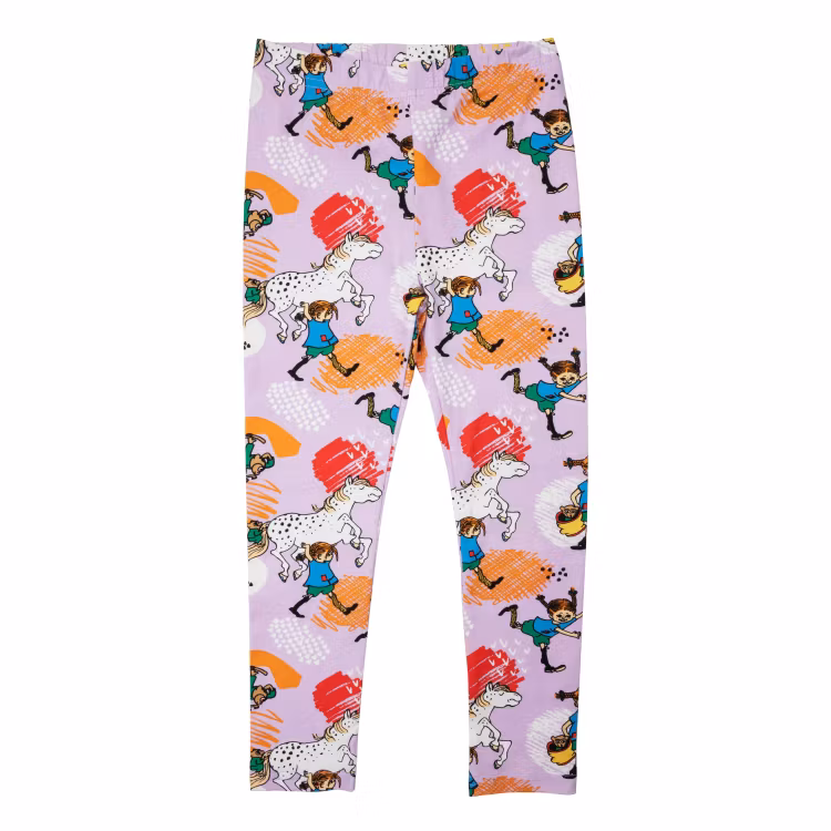 Sköna, lila leggings med Pippi Långstrump-mönster för barn. Infälld resår i midjan. Produkten innehåller certifierad ekologisk bomull.