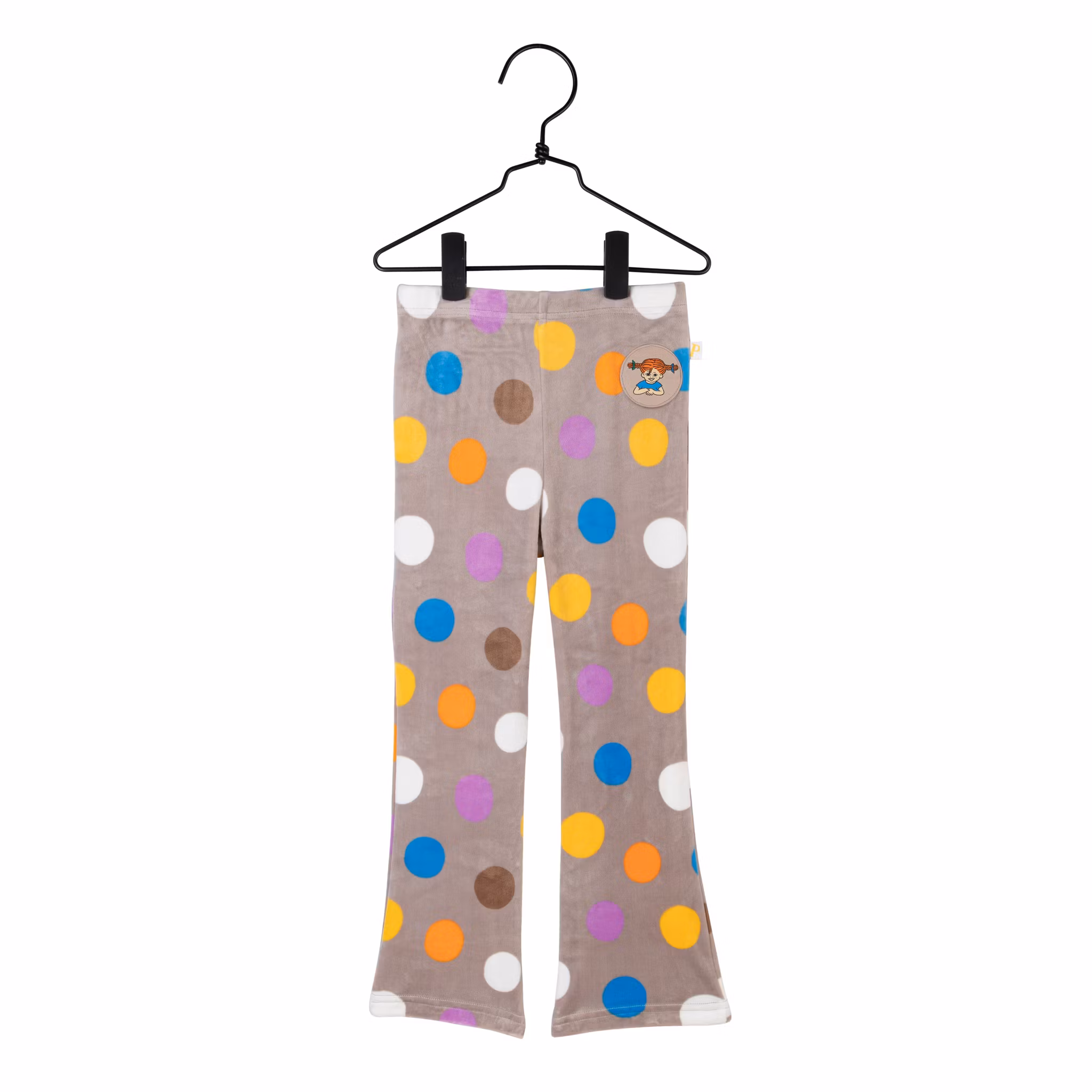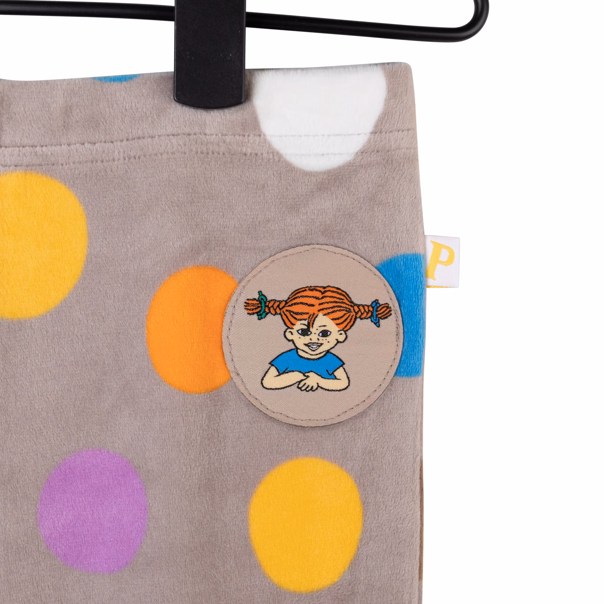 En underbart mjuk och skön babybyxa i beige velour av återvunnen polyester. Byxan är härligt helmönstrad med fina färgbubblor i vitt, gult, orange, lila och blått och upptill finns det ett runt Pippi-märke.