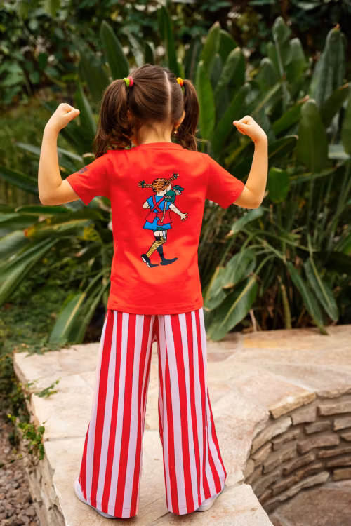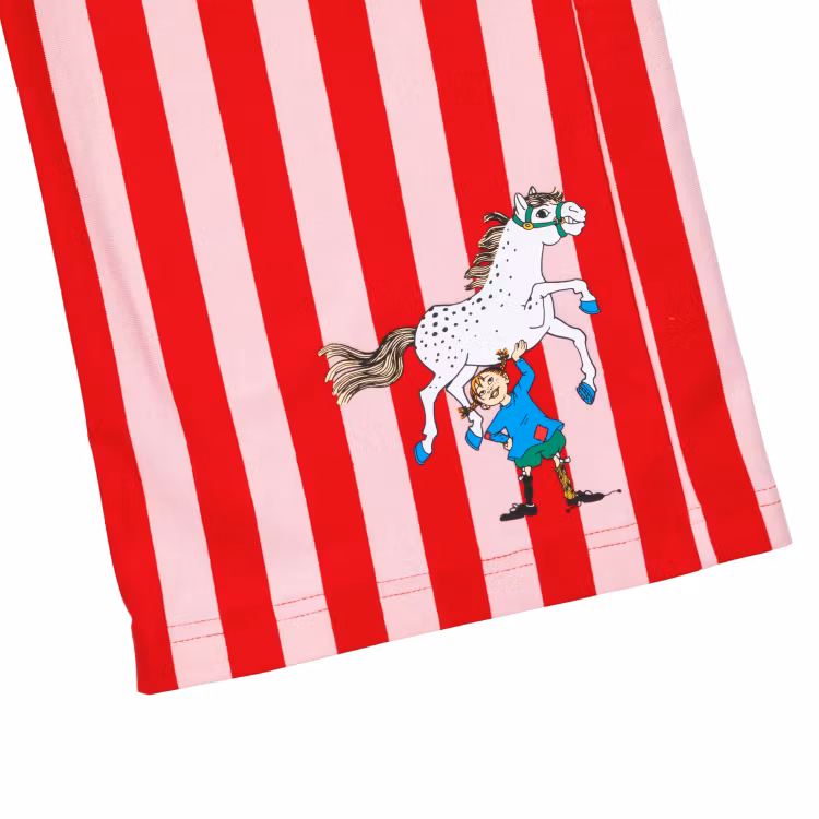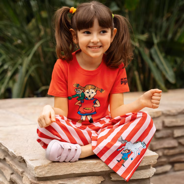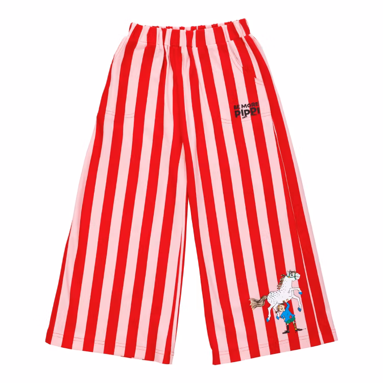 En mjuk och mysig Pippi byxa för barn. Med raka och breda ben, fickor, infälld resår i midjan och Pippi-tryck på ena benet. Produkten innehåller certifierad ekologisk bomull.