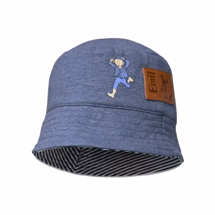 Blå vändbar solhatt med randig insida. Hatten har ett litet rubbertryck av en springande Emil, som håller i sin mysse, tillsammans med en etikett i konstskinn med en fartfylld bild och texten Emil på.