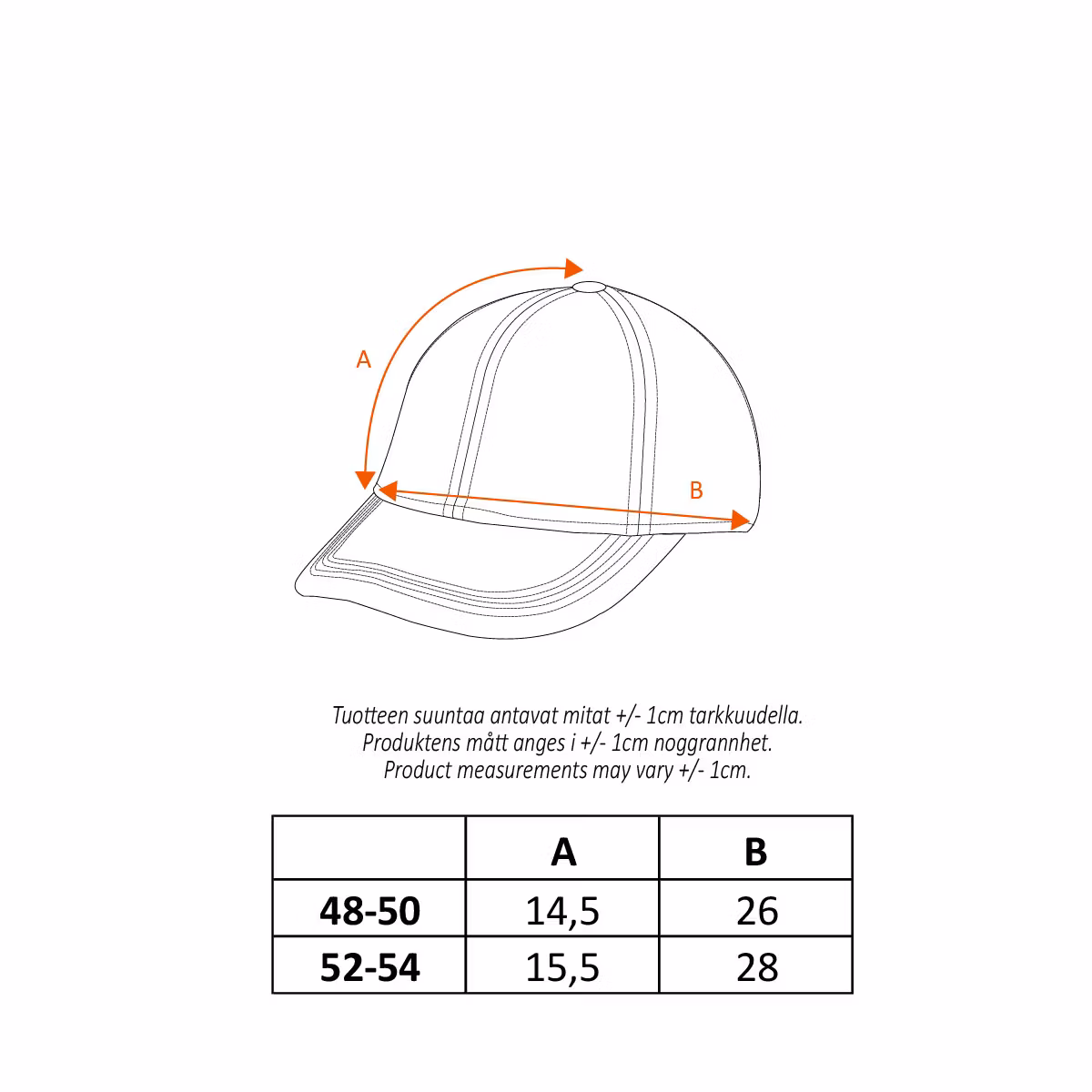 En klassisk keps med förböjd skärm, stadig framdel, broderade ventilationshål och ett justerbart spänne baktill.