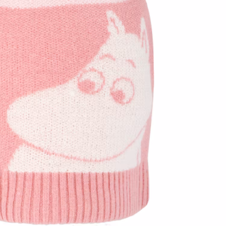 Barnmössa i värmande merionull med ett stort motiv med Mumintrollet på och en stor boll på toppen. Mössan har ett mjukt bomullsfoder som säkerställer att den är bekväm att ha på sig. Ribbstickad invikt kant.