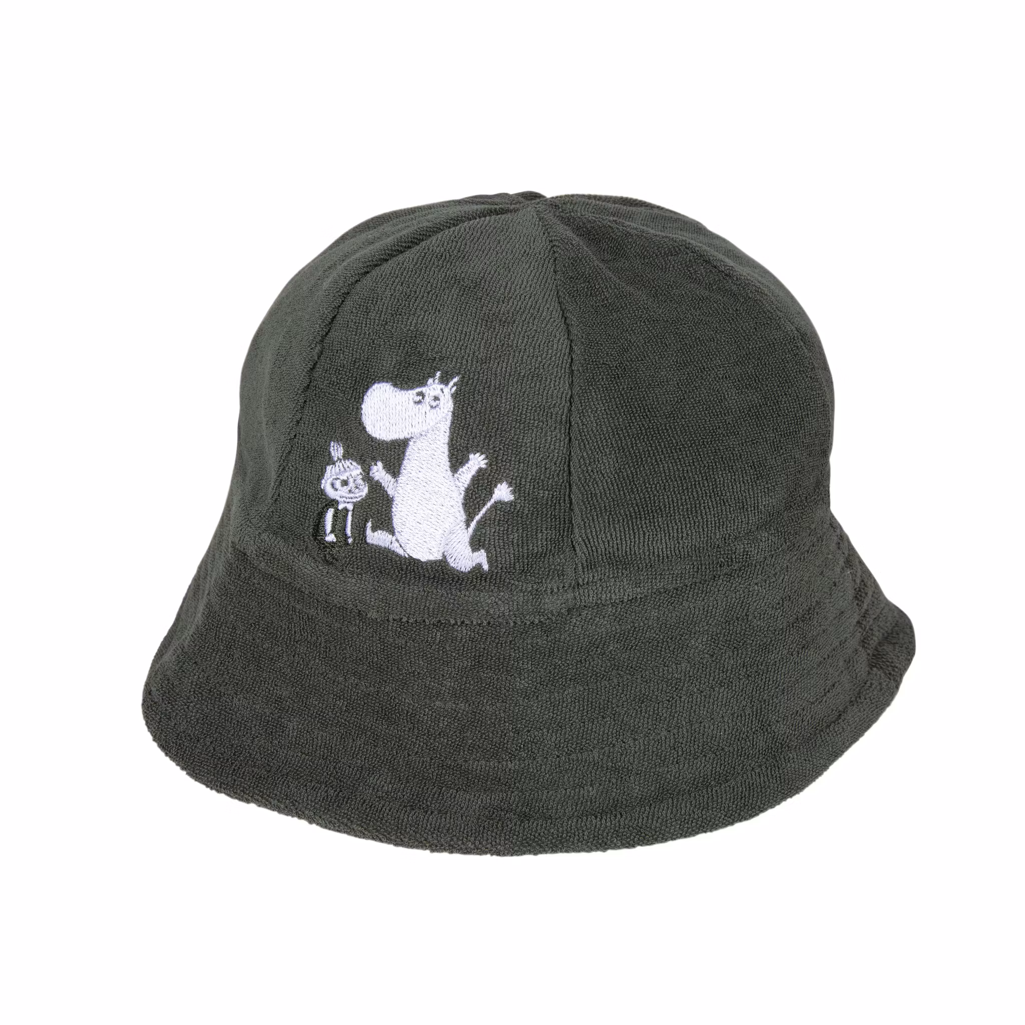 En mjuk och skön sommarhatt i bomullsfrotté, med en broderad bild av Mumintrollet och Lilla My.