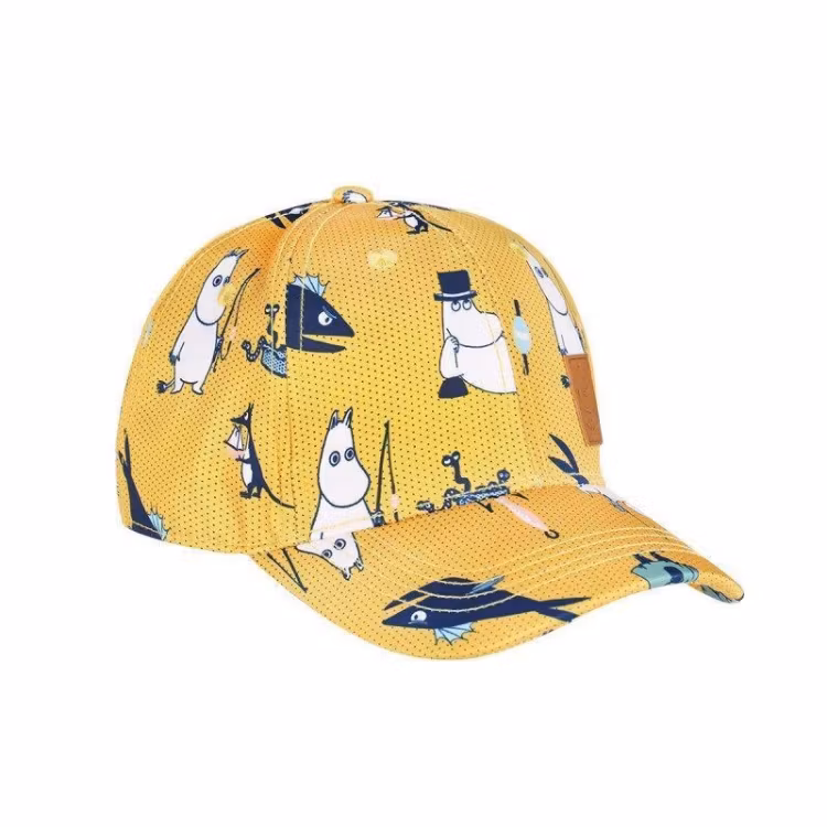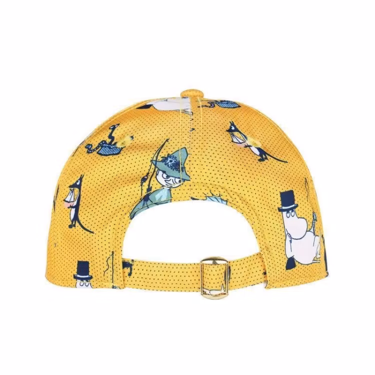 En klassisk keps med förböjd skärm och stadig framdel. Kepsen är miljösmart tillverkad i återvunnen polyester (GRS 4.0-certifierad) och den har en slät och lätt glansig yta. Kepsen har sex paneler, fyra broderade ventilationshål och ett justerbart spänne baktill. Framtill har den en påsydd Muminlogga i fuskläder. Kepsen är gul och helmönstrad med mumin figurer och fiskar.