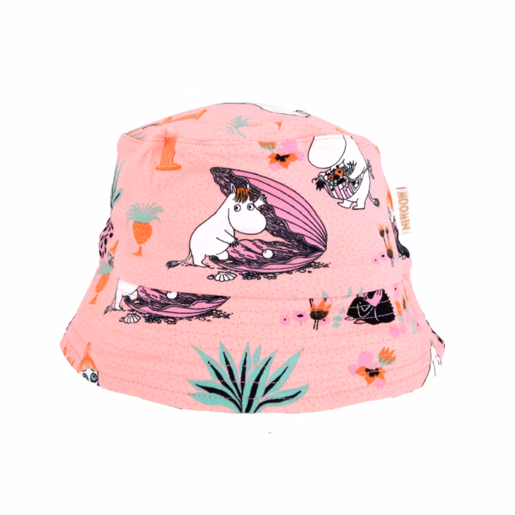 En söt sommarhatt i en varm nyans av rosa, med små, små prickar ton i ton. Lilla My, Mumintrollet och Snorkfröken har hittat en jättelik pärlmussla! Hatten är vändbar med vitrosa-randig insida. Öko-tex.