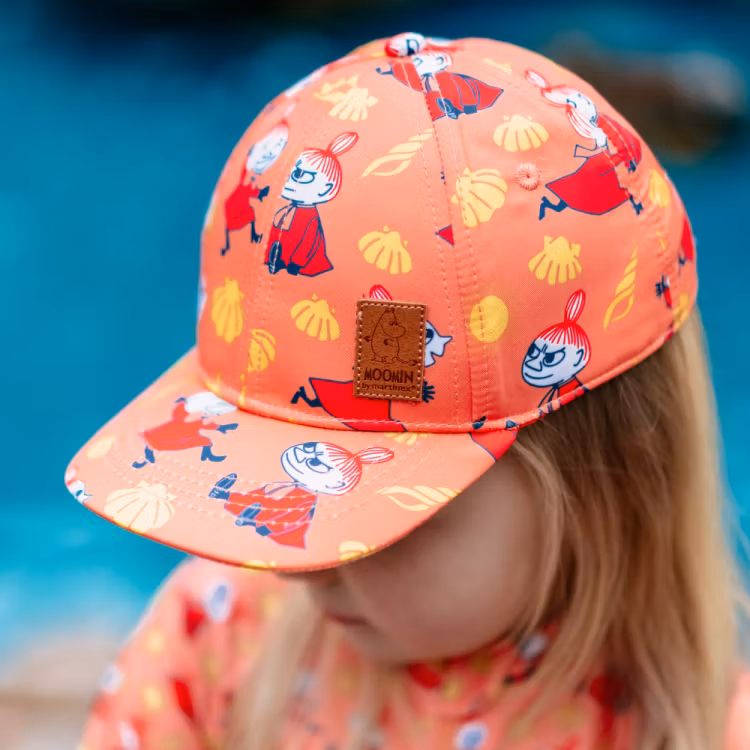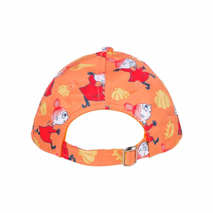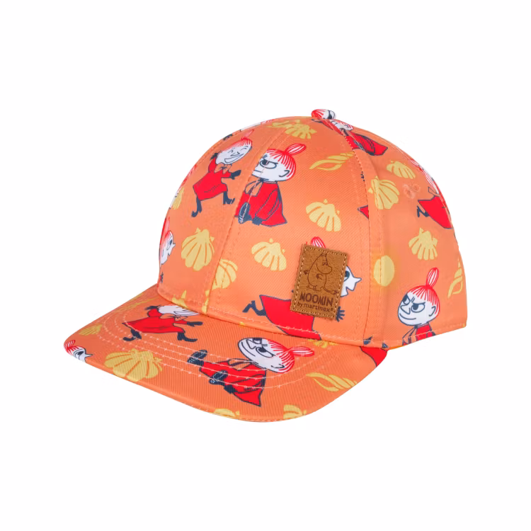 En klassisk keps med förböjd skärm, stadig framdel, broderade ventilationshål och ett justerbart spänne baktill. Kepsen är persiko-orange och härligt muminmönstrad med snäckor och Lilla My. Miljösmart tillverkad i återvunnen, GRS-certifierad polyester.